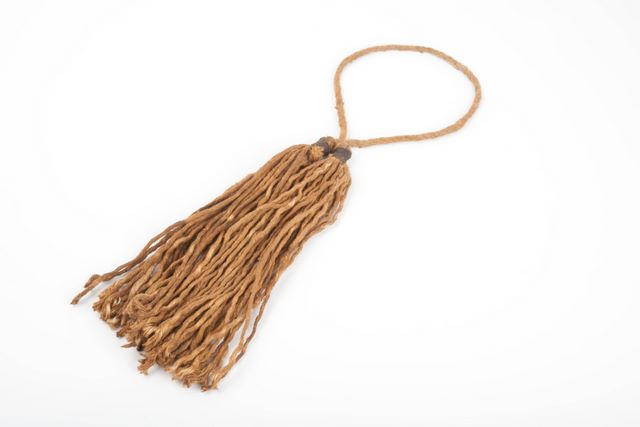Braçadeira tecida, constituída por faixa confeccionado com fios de algodão, tecidos segundo a técnica de torção em "Z". Apresenta dois pingentes formados com borlas da mesma matéria-prima