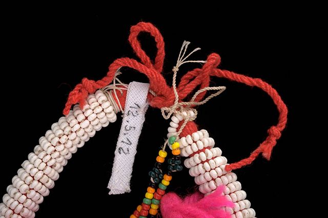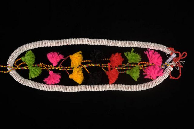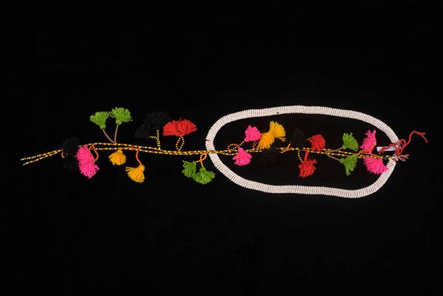 Colar de miçangas constituído de cordão de linha de lã vermelha envolto por fieira de contas de miçangas na cor branca. Exibe na parte posterior pingente que recai sobre a região dorsal,confeccionado com contas multicoloridas de miçangas e adornado por franjas arrematas com tufos de lã coloridas (verde, amarela, preta, vermelha e rosa fluorescente)