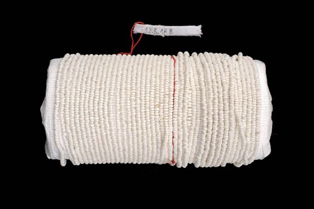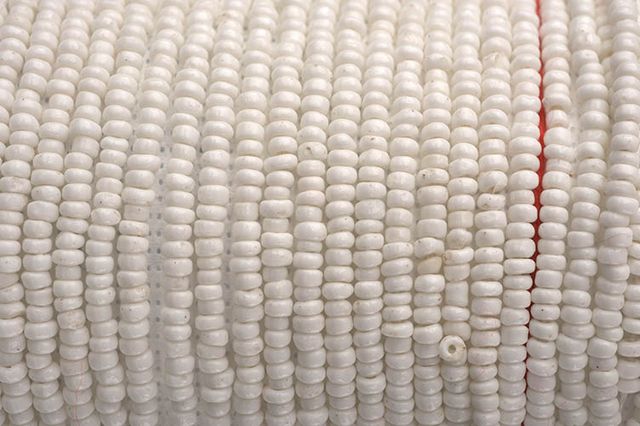 Tornozeleira de miçangas constituída de enfiadura de contas de miçangas, na cor branca, em cordel de linha de poliéster da mesma cor, formando um fio com comprimento avantajado,quando enrolado ao pulso forma uma faixa.Apresenta linha vermelha para amarrar o objeto ao corpo