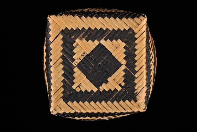 Cesto paneiriforme (urutu) de conformação circular confeccionado com lasca de arumã (Ischnosiphon spp), na cor natural e tingidas de preto, segundo a técnica do trançado sarjado e borda reforçada com acabamento com encaixe, formando motivos geométricos com padrões: faixas inferiores e superiores, "manapidana"; triângulos unidos "makaloo", borboleta. Umbigo iniciado em quadrado, sem nome ;Este objeto é feito com materiais provenientes do ambiente de caatinga, que é o que predomina na área da EIBC. O trançado é feito de arumã (Ischnosiphon spp Monocotiledonea, marantacea), pooapoa kantsa, sendo a borda dobrada para arremate, e fixada com cipó jacitara, kamawa, amarrado com barbante encerado, manapia, feito de curauá, heriwai + breu.;Os talos de arumã são tingidos com pigmento negro, oriundo da fuligem de querosene, encontrada em lamparinas (Querosene ittai) ;O fixador utilizados neste processo chama-se werama