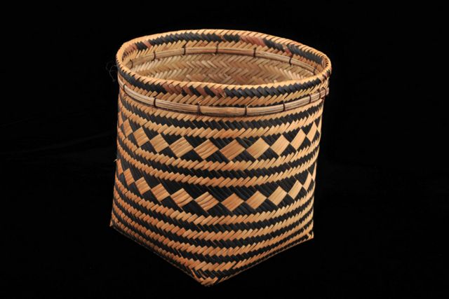 Cesto paneiriforme (urutu) de conformação circular confeccionado com lasca de arumã (Ischnosiphon spp), na cor natural e tingidas de preto, segundo a técnica do trançado sarjado e borda reforçada com acabamento com encaixe, formando motivos geométricos com padrões: makaloo triângulos unidos pelo vértice. ;O trançado é feito de arumã (Ischnosiphon spp Monocotiledonea, marantacea), pooapoa kantsa, sendo a borda dobrada para arremate, e fixada com cipó jacitara, kamawa, amarrado com barbante encerado, manapia, feito de curauá, heriwai + breu, maini. ;Os talos de arumã são tingidos com pigmento negro, oriundo da fuligem de querosene, encontrada em lamparinas (Querosene ittai). ;O fixador utilizados neste processo chama-se wirita panali. É de qualidade inferior, conferindo pouco brilho à peça.