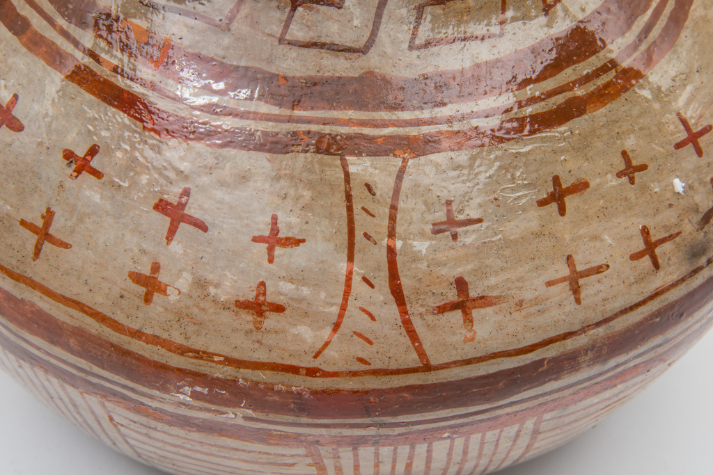 Os objetos desta coleção foram confeccionado durante a Oficina de Qualificação do Prodocult Baniwa coordenada pelo pesquisador Thiago Lopes da Costa Oliveira, entre os dias 30 de maio a 20 de junho de 2014. Este projeto refere-se a ações de documentação museológica e qualificação de acervos etnográficos a serem realizadas junto aos Baniwa do alto Rio Negro junto ao subgrupo hohodeni, que habita diversas aldeias na região do rio Aiari, um dos principais afluentes do rio Içana-área de ocupação imemorial dos grupos Arawak desta região. Este projeto beneficia-se da experiência de diversas etapas de pesquisa de campo já empreendidas nesta região, desde 2010, na aldeia de Ucuqui-Cachoeira e de extensa pesquisa de acervos de objetos etnográficos rionegrinos realizadas nos principais museus etnográficos do país. A peça continha o número 63 na coleção do organizador e possui um triângulo no fundo da mesma, na cor vermelha. A peça é também conhecida na localidade como camuti.;As peças foram produzidas por ceramistas do povo Baniwa da Aldeia São Joaquim, localizada no rio Aiari, Terra Indígena Alto Rio Negro. Os desenhos desta peça não são identificados "Iwidzooliwi". O barro usado para confecção das peças, precisa ser de boa qualidade, para resultar uma boa cerâmica. Localização geográfica do barro, Arari-Pira, Igarapé "Manapipawa". OBS: o aparecimento do tom vermelho, usando o " eewa", barro amarelo. A pintura amarela sobre a peça cinza escura se transformará em uma pintura vermelha sobre uma peça clara.;Com o processo da queima da cerâmica, as peças começam a escurecer e realça a pintura amarela que vai adquirindo um tom mais alaranjado, a cerâmica muda a coloração do cinza para o tom branco ou bege e a pintura também passa do amarelo para o vermelho quase laranja. E com o envernizamento as cores ficam mais escuras/acesas e acontece a transição para o vermelho, enquanto a pintura oxida, a peça desidrata;