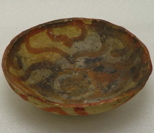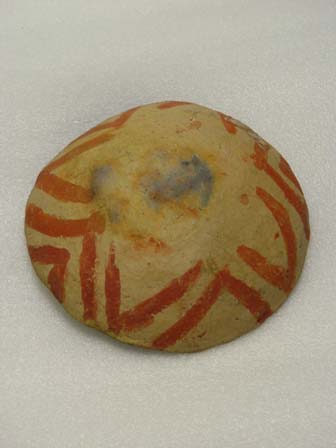 Prato de borda reta e base côncava apresentando externa e internamente decoração pintada formando motivos geometrizantes