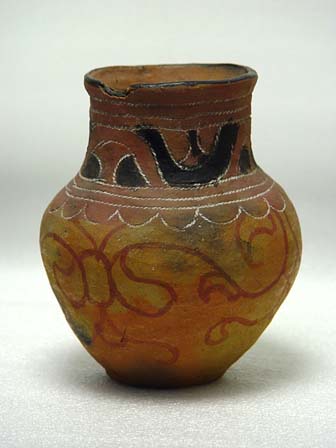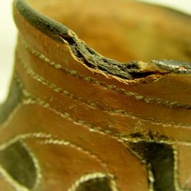 Pote de borda extrovertida, contorno simples e base plana. Apresenta parte superior do bojo e gargalo decorado com motivos geometrizantes "marcado - com - corda" e parte inferior do bojo, decorado, com os mesmos motivos pintados