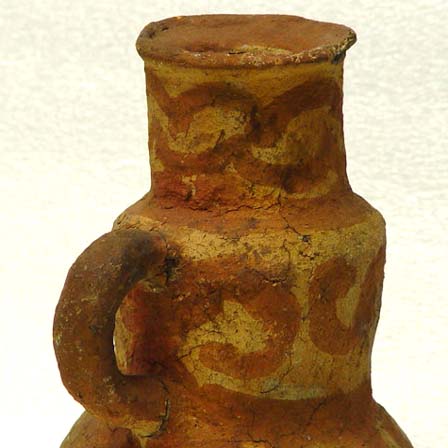 Moringa de borda extrovertida, contorno complexo e base plana. Apresenta na superfície externa decoração com motivos geometrizantes pintados