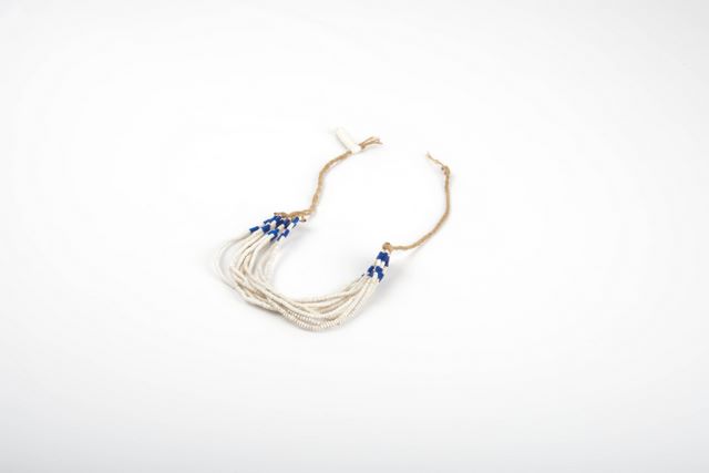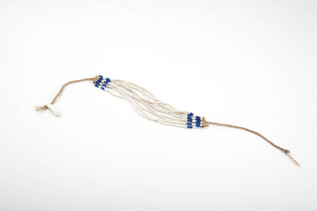 Pulseira confeccionado com 9 (nove) fieiras de miçangas nas cores: brancas e azuis dispostas paralelamente umas as outras, presas nas extremidades em um rolete de madeira de paxiúba (Socratea exorrhiza (Mart.) H. Wendl)com linha de algodão (Gossypium spp.) e o mesmo formando um cordel para amarração