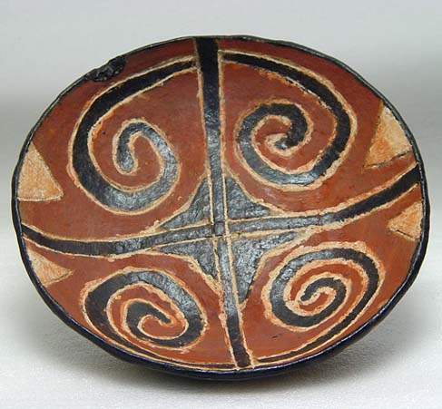 Prato de borda reta e base plana, exibindo superfície interna decorada com motivos geometrizantes incisos