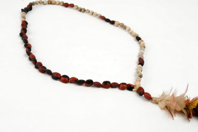 Colar de sementes confeccionado com sementes de "Lágrimas de Nossa Senhora" e "olho de cabra" apresentando pingente de penas rosas de colhereiro (Ajaia ajaja (L.)), vermelhas de arara (Ara macao (L.)) e penugens marrons de ema (Rhea americana (L.))