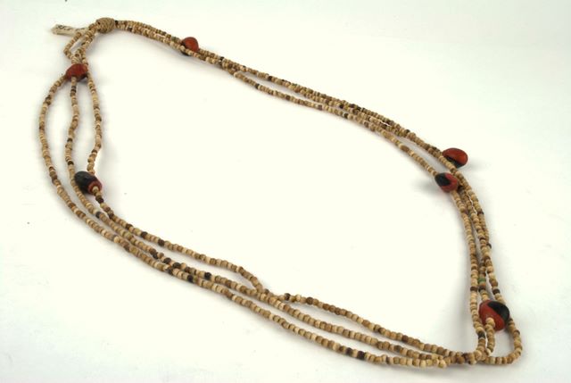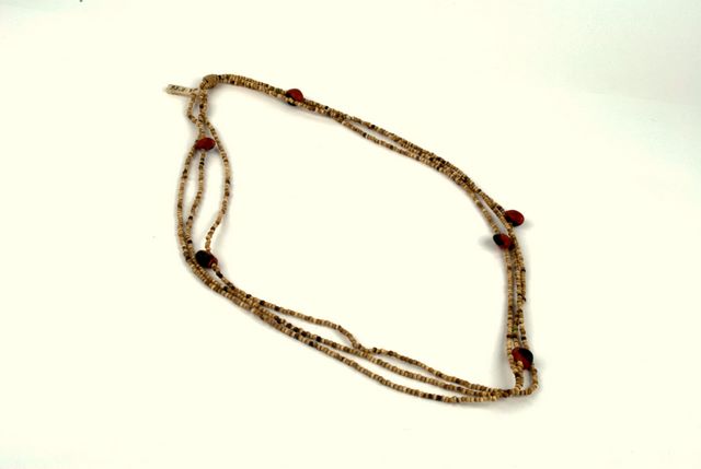 Colar de sementes, confeccionado com sementes de tiririca ("Aè"), com três voltas: a primeira volta contendo uma semente de olho de cabra, a segunda volta contendo duas sementes de olho de cabra e a terceira com três sementes de olho de cabra. As três voltas são amarradas com corda de buriti